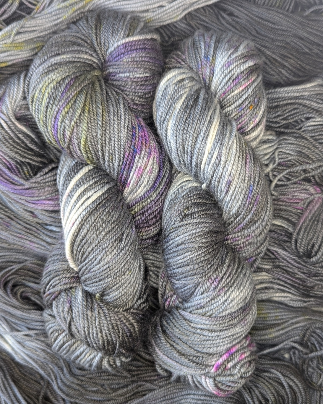 Saturn Returns is a variegated mix of rich, mid-toned grey, pale grey, and cool, pearly white with speckles of gold, magenta, and deep violet. Your favorite cozy grey sweater with a touch of visual interest and depth from the multicolored speckles. I originally dyed this on my 30th birthday to make myself a special sweater to wear for my next birthday celebration. I loved this colorway too much not to make it a permanent part of the collection. Dyed to order in the base of your choice.