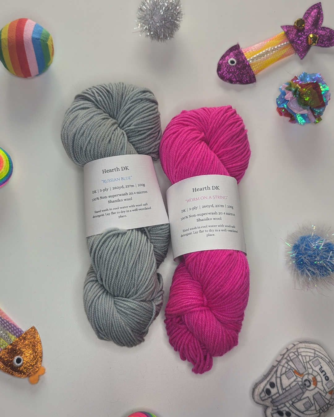 A cool silver yarn inspired by the exquisite Russian Blue. This creates a beautiful, neutral fabric on its own, but also pairs well with its favorite toys, Feather Dancer and Worm on a String!